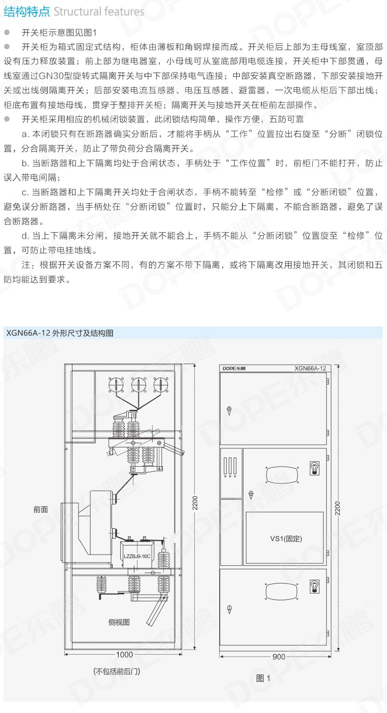 2.开关柜中下部贯通,母线室通过GN30型旋转式隔离开关与中下部保持电气连接。